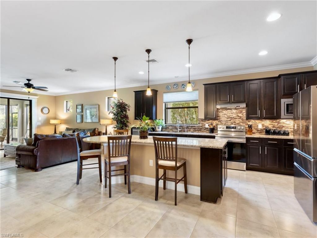 This two-bedroom plus den saltwater pool home in Bridgetown at The Plantation offers over 1,900 square feet of living space with volume ceilings and designer finishes throughout. Upon entry through the hurricane glass led inlet door, tile and luxury vinyl flooring set an elegant atmosphere complemented by earth-tone paint and abundant natural light. Crown molding and tray ceilings add to the refined ambiance. The kitchen serves as a central gathering area, featuring a large granite island, desig...This two-bedroom plus den saltwater pool home in Bridgetown at The Plantation offers over 1,900 square feet of living space with volume ceilings and designer finishes throughout. Upon entry through the hurricane glass led inlet door, tile and luxury vinyl flooring set an elegant atmosphere complemented by earth-tone paint and abundant natural light. Crown molding and tray ceilings add to the refined ambiance. The kitchen serves as a central gathering area, featuring a large granite island, designer pendant lighting, a stylish backsplash, and new appliances installed in 2023-including an LG French Door refrigerator, LG convection oven, and top of the line Bosch dishwasher. All cabinetry is equipped with built-in pullouts for optimal storage. Adjacent to the kitchen is a private coffee bar with pullout drawers, additional cabinetry, professional Marvel beverage refrigerator with drawer, and a walk-in pantry fitted with custom shelving and pullouts.The main living area is spacious and bright due to extra windows and includes a 65 inch Sony Bravia TV with Sonos soundbar for enhanced entertainment. Bedrooms are split for privacy, with the primary suite overlooking the pool and offering a large walk-in shower, built in 55 inch LG TV, and a closet with custom built-ins. Outdoor amenities include lush landscaping, a private preserve, a custom saltwater pool with water feature, a new 55 inch TV with full motion mount to watch while in the pool, and a picture screen lanai cage providing unobstructed views. The garage features plenty of room for a golf cart or additional storage, floor mats for protection, and a remote controlled screened door for maximum airflow and privacy. It houses the whole-house Kinetico water system and a hot water tank installed in 2024. The 18 SEER, quiet Rheem HVAC system with Smart thermostat, also newly installed in 2024, includes an air purifier to keep electric bills low. Comprehensive hurricane protection is provided with accordion shutters and remote controlled Electrical Shutters. Bridgetown's low HOA includesComcast upgraded cable package and high speed internet. Just minutes away by golf cart or car, the amenity center offers a host of recreational activities: tennis, pickleball, bocce ball, fitness classes, gym workouts, lap swimming, or simply lounging by the pool. This residence offers a perfect blend of luxury, comfort, and resort-style living-welcome home!