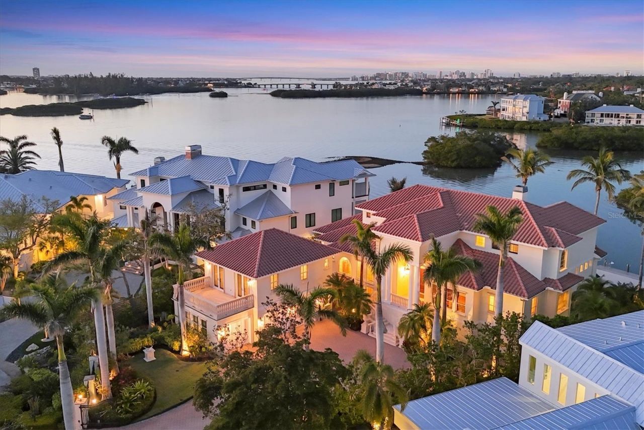 One or more photo(s) has been virtually staged. Located West-of-Trail in one of Sarasota's sought-after neighborhoods, Oyster Bay Estates, this stunning waterfront home is designed for those who appreciate breathtaking views and effortless entertaining. With a prime position on Sarasota Bay, this gated estate captures panoramic vistas of the city skyline, preserve and mangrove islands, and beyond. Blending timeless elegance with modern comforts, the home offers seamless indoor-outdoor living, qu...One or more photo(s) has been virtually staged. Located West-of-Trail in one of Sarasota's sought-after neighborhoods, Oyster Bay Estates, this stunning waterfront home is designed for those who appreciate breathtaking views and effortless entertaining. With a prime position on Sarasota Bay, this gated estate captures panoramic vistas of the city skyline, preserve and mangrove islands, and beyond. Blending timeless elegance with modern comforts, the home offers seamless indoor-outdoor living, quality finishes and thoughtfully designed spaces. A grand entrance sets the stage, with travertine stairs leading to stately double doors completed by a transom arch window. Inside, the living and dining areas boast a detailed coffered ceiling framed by a wall of sliders that showcase uninterrupted water views. A gas fireplace with a carved stone mantle anchors the space while custom wood shelving, wainscoting-lined hallways and artisanal millwork accentuate timeless craftsmanship. For culinary enthusiasts, the gourmet kitchen is functional and luxurious. Anchored by an oversized central island with a prep sink, it offers abundant workspace, granite countertops and custom wood cabinetry. A top-of-the-line Viking appliance package pairs seamlessly with a Sub-Zero professional-grade refrigerator, while a deep basin sink and a spacious walk-in pantry with custom organization enhance convenience. An adjoining butler's pantry elevates the space with glass-faced cabinetry, a beverage cooler and dishwasher drawers. The casual dining area is positioned to take in breathtaking water views, making every meal a scenic experience. The expansive great room boasts windows that capture views of mangrove islands, city lights and the tranquil waters beyond. Multiple bar areas, each equipped with beverage coolers, prep sinks, dishwasher drawers and granite countertops, ensure effortless entertaining. Retreat to the primary suite, a private sanctuary with a custom tray ceiling, a designer chandelier and bay windows that invite the amazing view in. The spa-inspired en-suite bath features travertine tile, dual vanities, a spacious walk-in shower with multiple showerheads, a jetted tub and an expansive custom-organized closet. A gracefully curved wood staircase ascends to the upper level, where four additional en-suite guest rooms offer luxurious accommodations, most with private balconies that frame breathtaking views. A three-stop elevator provides easy access across all levels. Ideal for large-scale entertaining, the home features a ground-level bonus area, storage and workshop, opening to the resort-style pool deck for seamless indoor-outdoor living. A private guest apartment, accessible via a separate staircase and above the garage, provides a serene retreat with a living room kitchenette, a spacious bedroom, a full bath and a private balcony. This estate has been thoughtfully crafted for elegance and entertainment, featuring Brazilian cherrywood floors, custom-trimmed doorways, wainscoting accent walls, crown molding, plantation shutters, custom-designed coffered and tray ceilings, and a central vacuum system, among other fine details. With stunning water vistas as its backdrop, this is more than just a home, it is a lifestyle conveniently near The Field Club, Southside Village and downtown Sarasota.