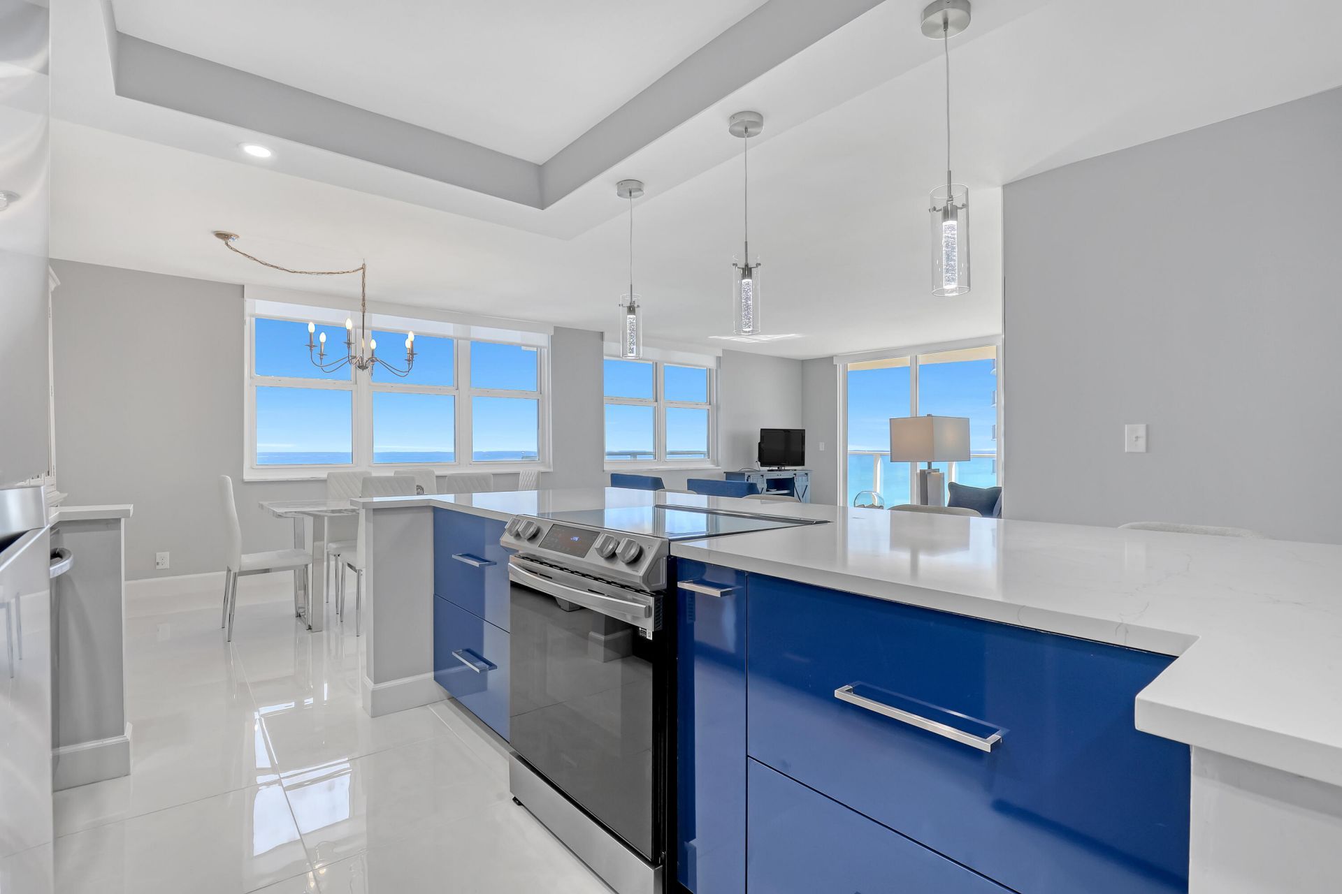 Step into this exquisitely remodeled corner-unit condo and enjoy breathtaking ocean views from every window. This spacious 2-bedroom, 2-bath residence has been thoughtfully redesigned for modern coastal living, seamlessly blending elegance, comfort, and functionality. Upon entry, you're immediately greeted with gleaming porcelain tile floors that reflect the shimmering ocean just beyond your windows. The brand-new chef's kitchen is an entertainer's dream, featuring a large quartz island, sleek m...Step into this exquisitely remodeled corner-unit condo and enjoy breathtaking ocean views from every window. This spacious 2-bedroom, 2-bath residence has been thoughtfully redesigned for modern coastal living, seamlessly blending elegance, comfort, and functionality. Upon entry, you're immediately greeted with gleaming porcelain tile floors that reflect the shimmering ocean just beyond your windows. The brand-new chef's kitchen is an entertainer's dream, featuring a large quartz island, sleek modern cabinetry, stainless steel appliances, and a dedicated coffee bar and wine station. The open-concept living and dining area is wrapped in floor-to-ceiling views and enhanced by motorized shades, creating a refined yet relaxed atmosphere. Both bedrooms feature engineered hardwood flooring. The primary suite offers a custom walk-in closet and a spa-inspired ensuite with a walk-in shower. Step out onto the covered wrap-around balcony to take in sweeping views of the ocean, Intracoastal Waterway, and city skyline perfect for morning coffee or sunset cocktails with the sea breeze.Fully furnished residence with major upgrades completed in 2024, including a new A/C, electrical panel, and water heater. Additional conveniences include an assigned covered parking space and a private storage closet.Residents enjoy an array of resort-style amenities, including a pool, fitness center with sauna, billiards and game room, a library and bike storage. Ideal as a primary residence, vacation retreat, or investment opportunity, this sophisticated oceanfront oasis is truly a place to call home.